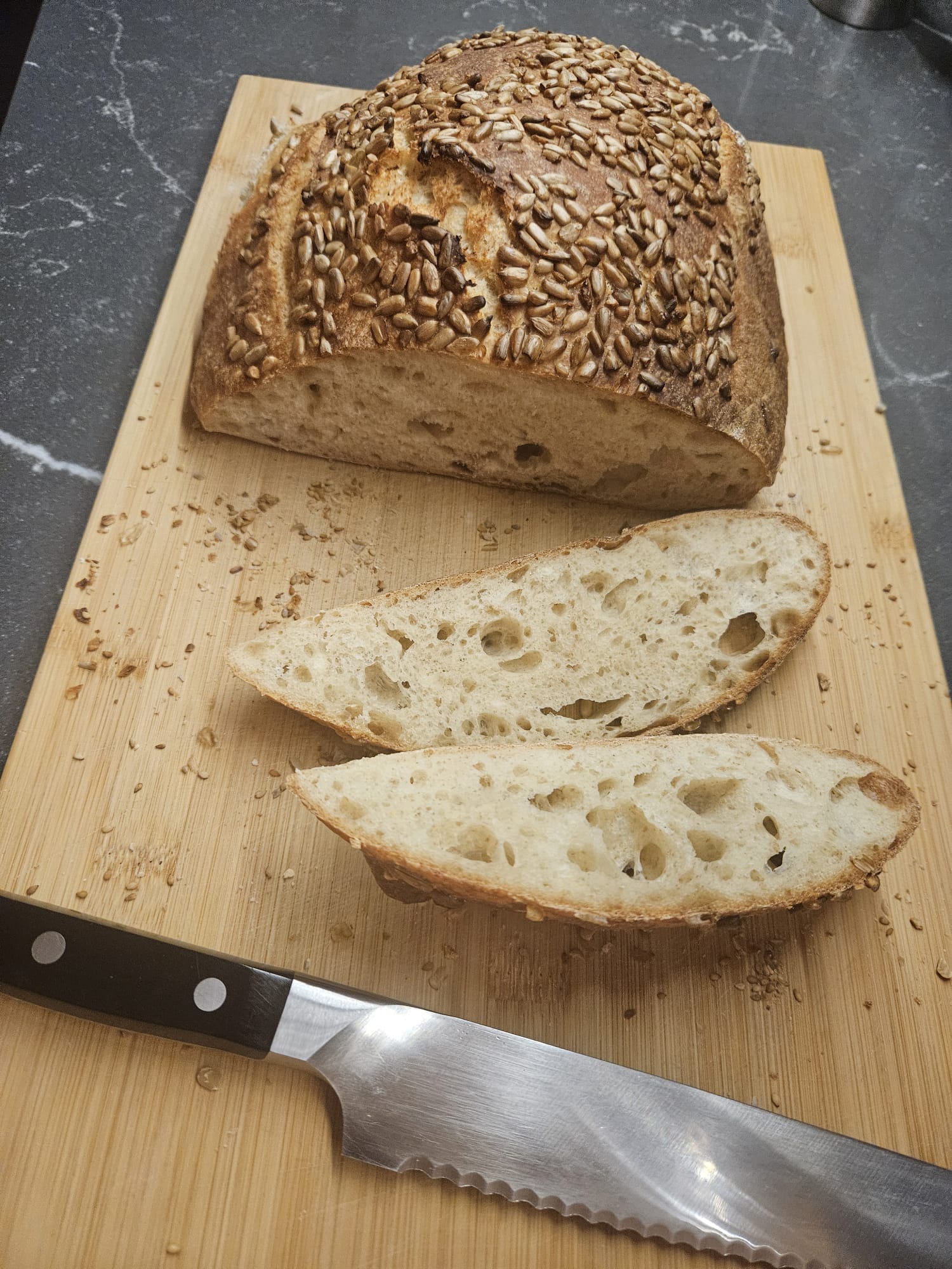 Habe jetzt 3/4 geschnitten und eingefroren. Dann kann man einzelne Scheiben herausholen und toasten (zum Auftauen).