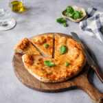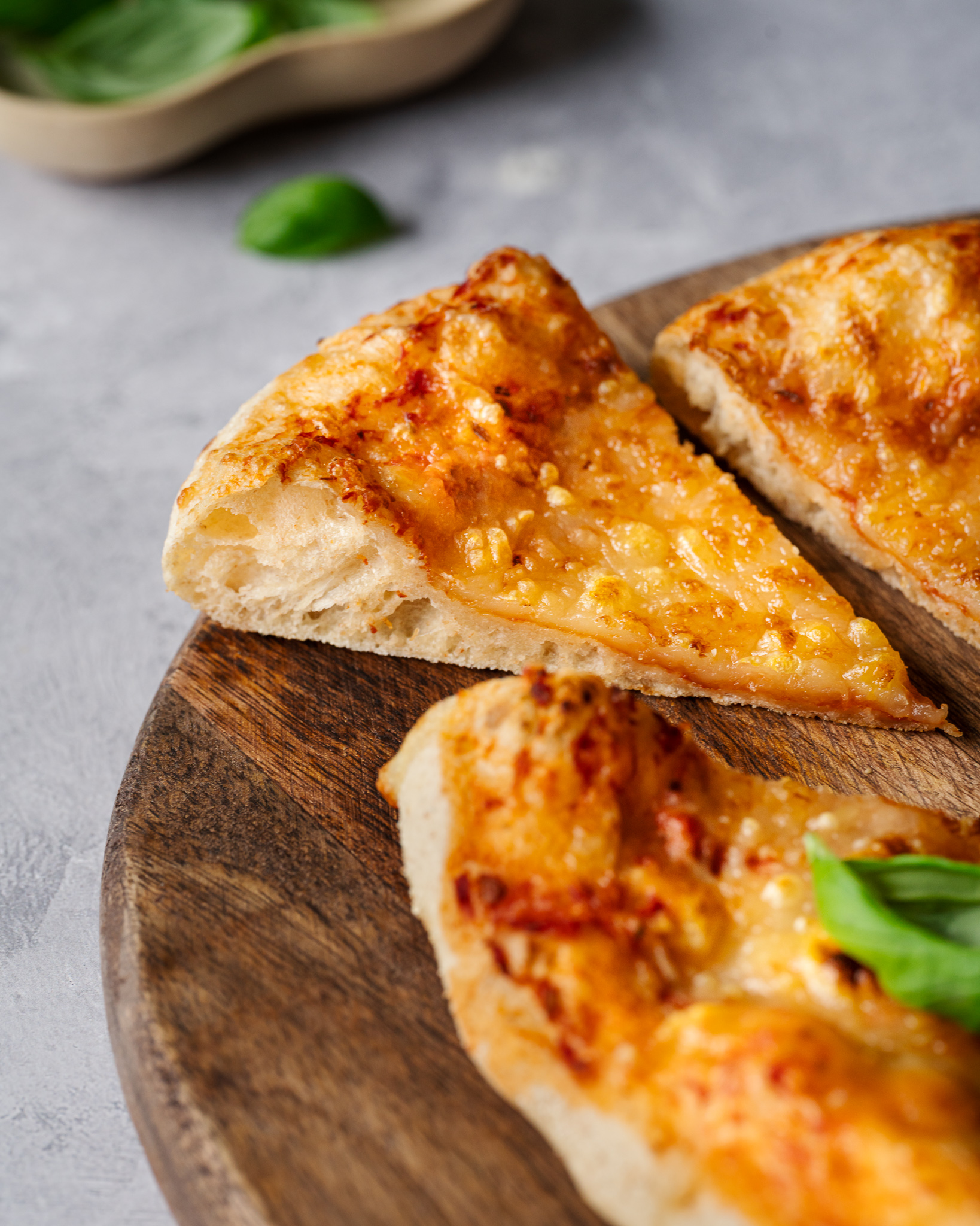 Bei der Zubereitung nach neapolitanischem Stil wird der Teig nicht ausgerollt, sondern mit den Händen sanft auseinandergezogen. Der Teig ist bewusst etwas weicher, sodass beim Backen der Rand („cornicione“) schön aufgeht und locker bleibt. Durch die schnelle Backzeit bei extrem hohen Temperaturen entsteht diese charakteristische Luftigkeit – der Boden bleibt dabei weich und flexibel statt knusprig. Auch ohne professionellen Pizzaofen gelingt die Pizza: einfach den Ofen so heiß wie möglich vorheizen und den Teig direkt auf ein Backstahl/Backstein backen, wenn vorhanden.